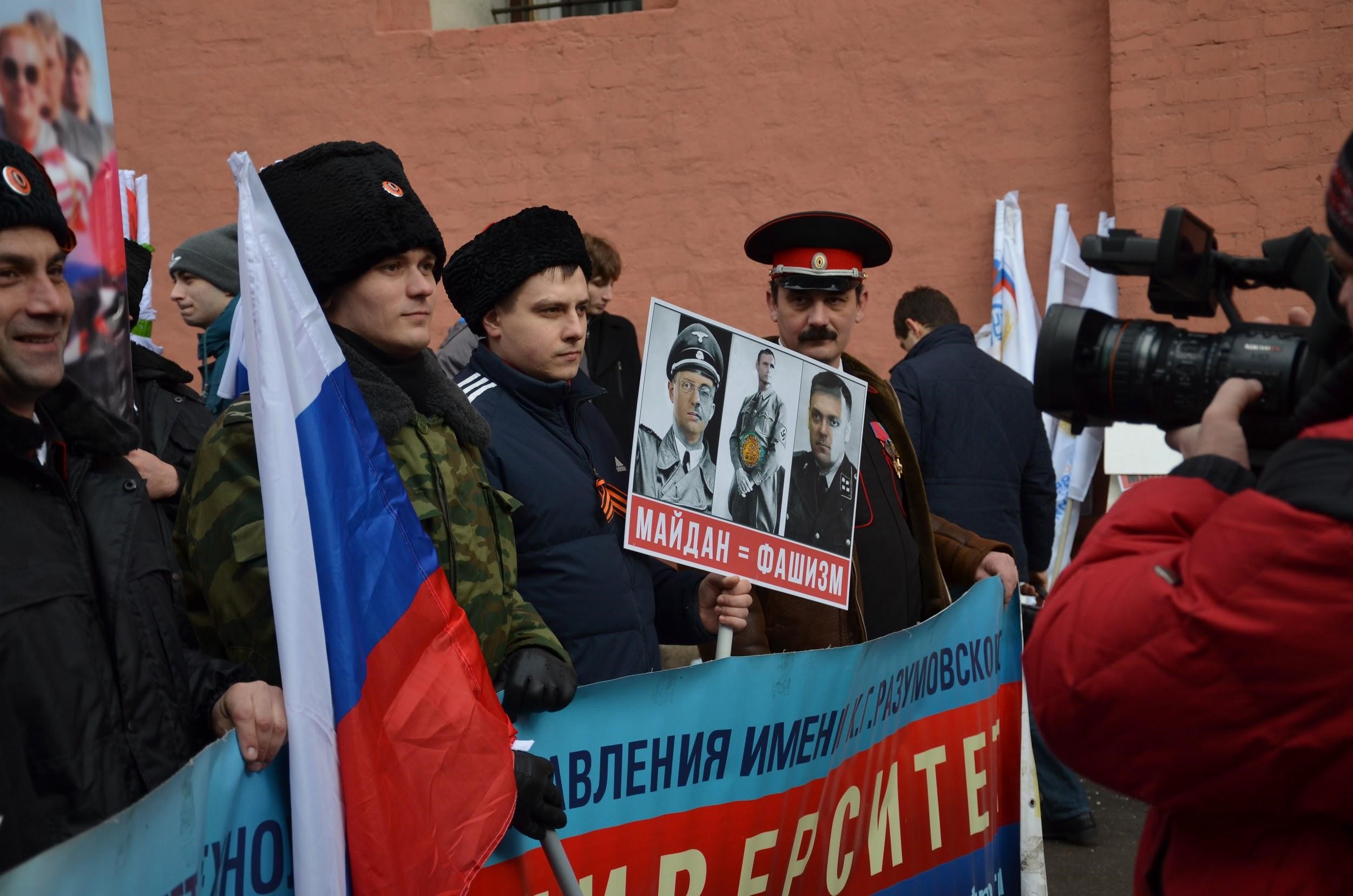 Тезис о том, что “майдан=фашизм” прописан на каждом втором плакате. Огромное количество школьников и пенсионеров. Колоритные байкеры и казаки теряются на их фоне. Откуда-то появляются люди с флагами Чечни и Кадырова-старшего. Местами мелькают красно-бело-черные триколоры с зелеными звездами. В голове мелькнуло - “Сирия”. Отхожу немного в сторону и гуглю. 3-G тупит, но все таки выдает ответ. Моя догадка была правильной. Оборачиваюсь. Рядом со мной стоит чувак с российским флагом и сирийским шарфом. К нему подходят 2 других чувака. Один - низенький дрыщ явно восточной наружности с георгиевской лентой на лямке рюкзака. Второй - рослый детина, судя по внешности и отсутствию акцента - русский. Ребята здороваются и начинают выяснять, почему сириец не мог дозвонится русскому. Проблема исчерпана. Ребята проходят дальше в толпу.