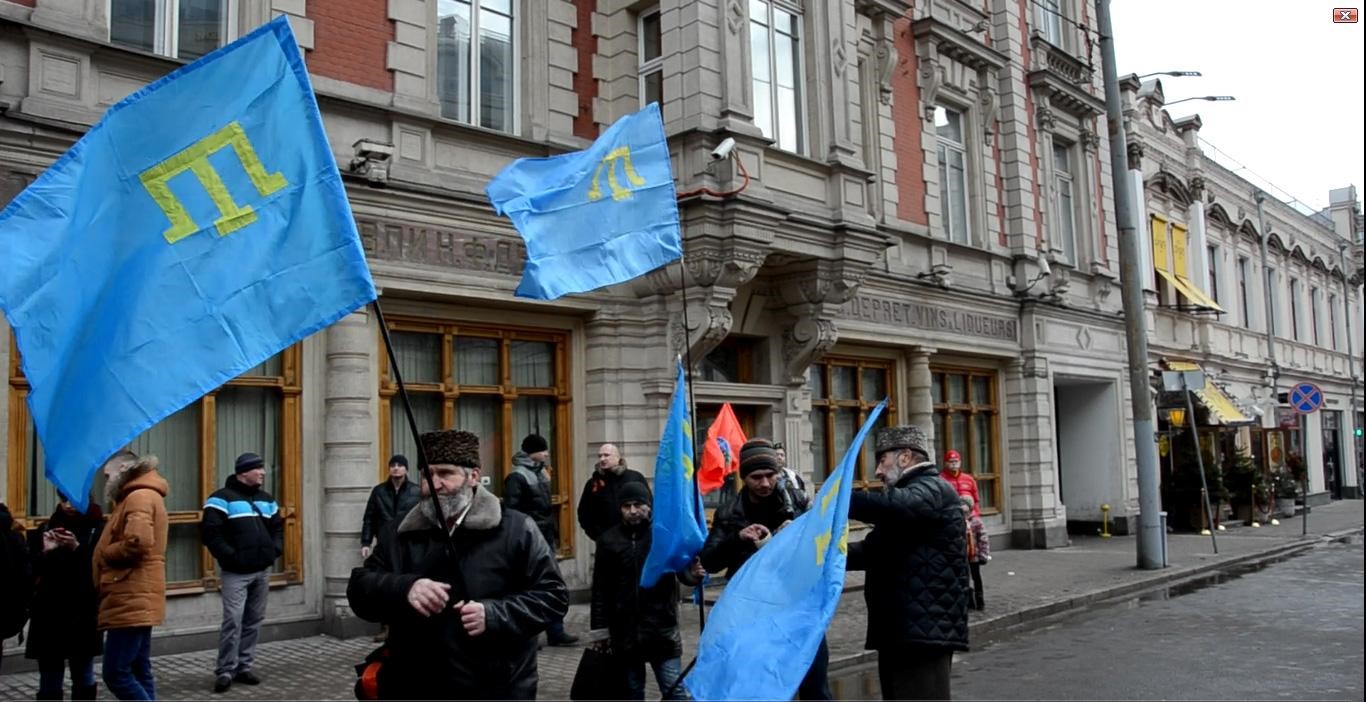 У обочины трое мужчин с ярко-голубыми флагами. Приглядываюсь - флаг крымских татар. Восточную внешность этих мужчин отрицать достаточно сложно, но идентифицировать их национальную принадлежность только по флагам было бы неправильно. Тем более, что флаги, значки, ленточки и плакаты активисты многим раздавали прямо на месте.
