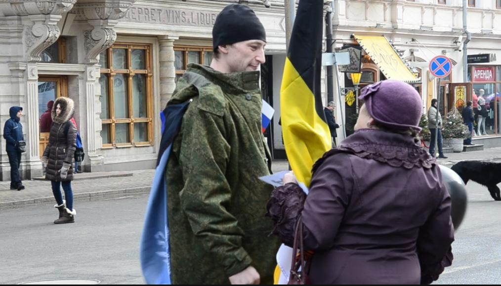 11 утра. Выхожу из перехода на Пушкинской. Улица непривычно пустая. Автомобильное движение уже перекрыто. Поперек улицы уже выстроены “рамки”. За пол-года в Москве они уже не воспринимаются как диковинка. Прохожу через одну из них, показываю милиционеру полицейскому содержимое рюкзака. Нетбук, зеркалка, штатив, куча зарядок. Мент лениво полузаглядывает в рюкзак. Ему откровенно скучно. Спокойно прохожу дальше, на ходу достаю и включаю камеру. Официально митинг только начался. Ничего интересного. Фоткаю байкера у которого в руках флаг с ликом Иисуса. Оборачиваюсь. Три афганца рассказывают ребятам с одного из федеральных каналов, о том, что кто-то из их укрАинских товарищей сейчас воюет на стороне Киева. У ребят явный разрыв шаблона. Боевые товарищи вдруг стали карателями из телевизора. На словах про “Россию-Империю” меня передергивает.