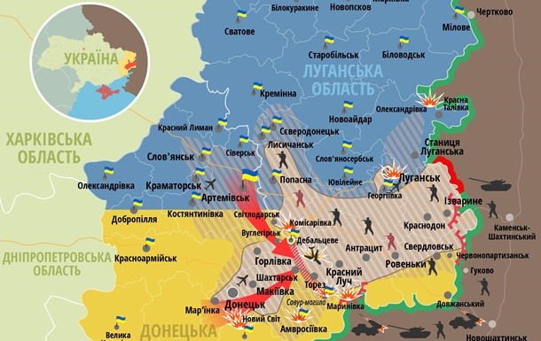 - 28-29 июля начал свое действие третий этап санкций: запрет на импорт нефтедобывающих технологий, новые ограничения для российского капитала. В этот момент у «мирных ополченцев Донбасса» появились первые танки, Славянск уже был глубоко в украинском тылу, за сутки 29-го июля пресс-центр АТО зафиксировал 7 обстрелов и одну танковую атаку (7 единиц). Карта АТО выглядела, если что, вот так: