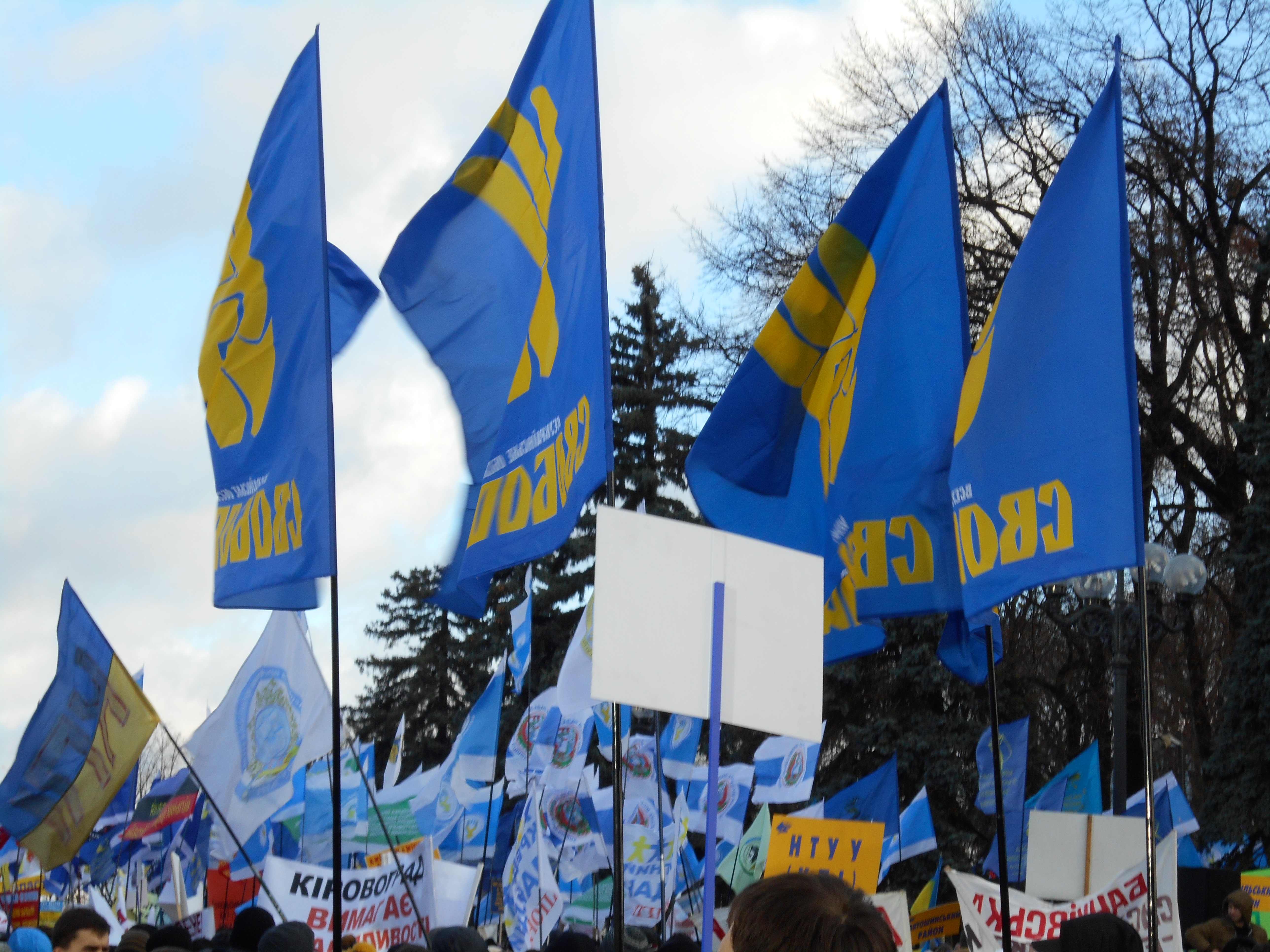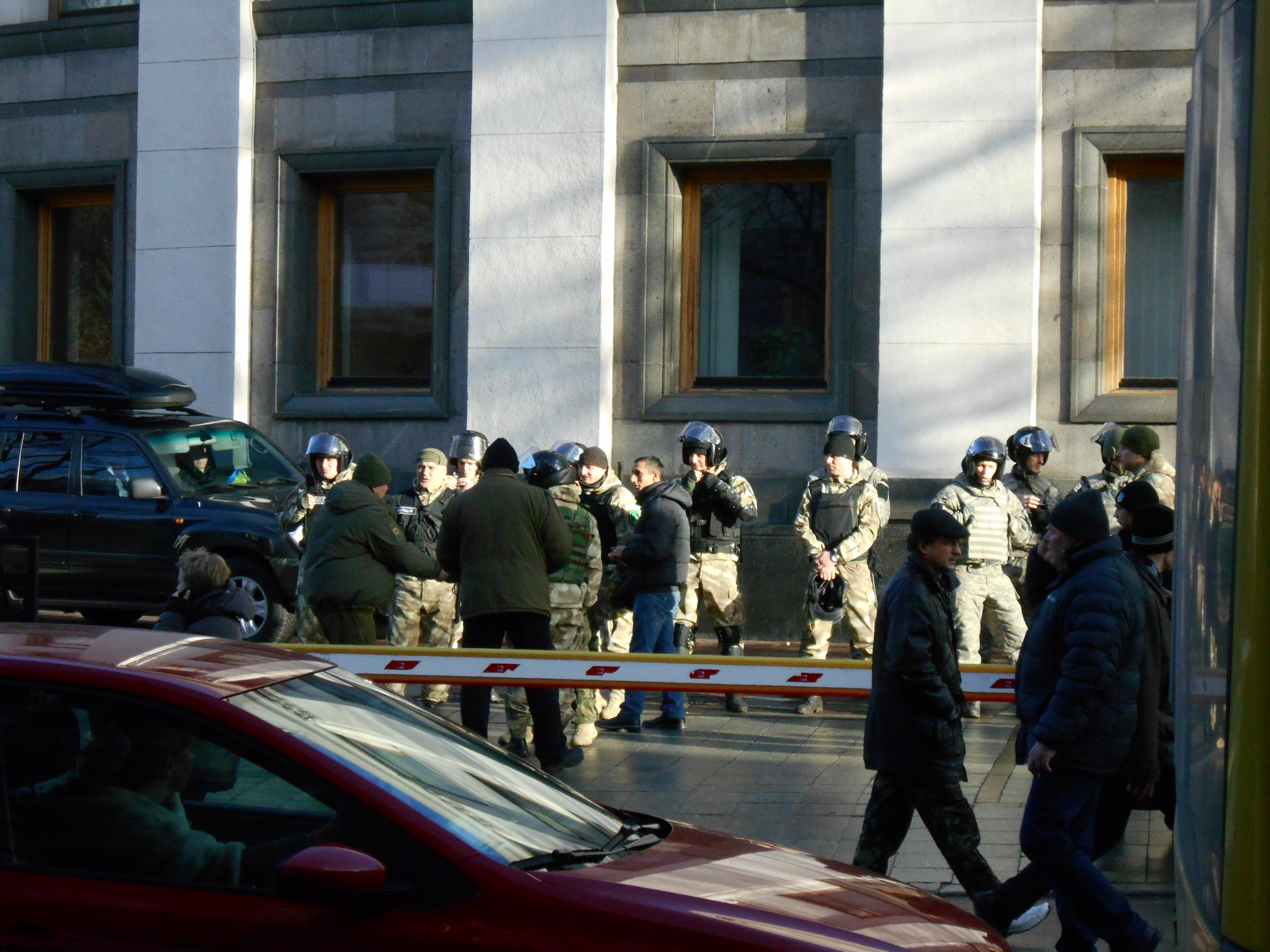 Двигаюсь в сторону парламента. Там собралось людей в несколько раз больше, чем под Кабмином. Тут тебе и партия «Свобода», крики которой об антинародном бюджете не отличаются ничем от выкриков «Коммунистической партии», а также небольшие группы студентов с плакатами университетов, учителя, пенсионеры, чернобыльцы, профсоюзы, авто- и финансовый Майдан. Также неподалеку стоят несколько ребят в балаклавах, которые обещают милиционеру не устраивать провокаций. Они называют себя реваншистами, соответственно на флагштоке реет знамя «Ардити». Весь этот суп состоит приблизительно из 3000 персон. Кто-то приходит, кто-то уходит.