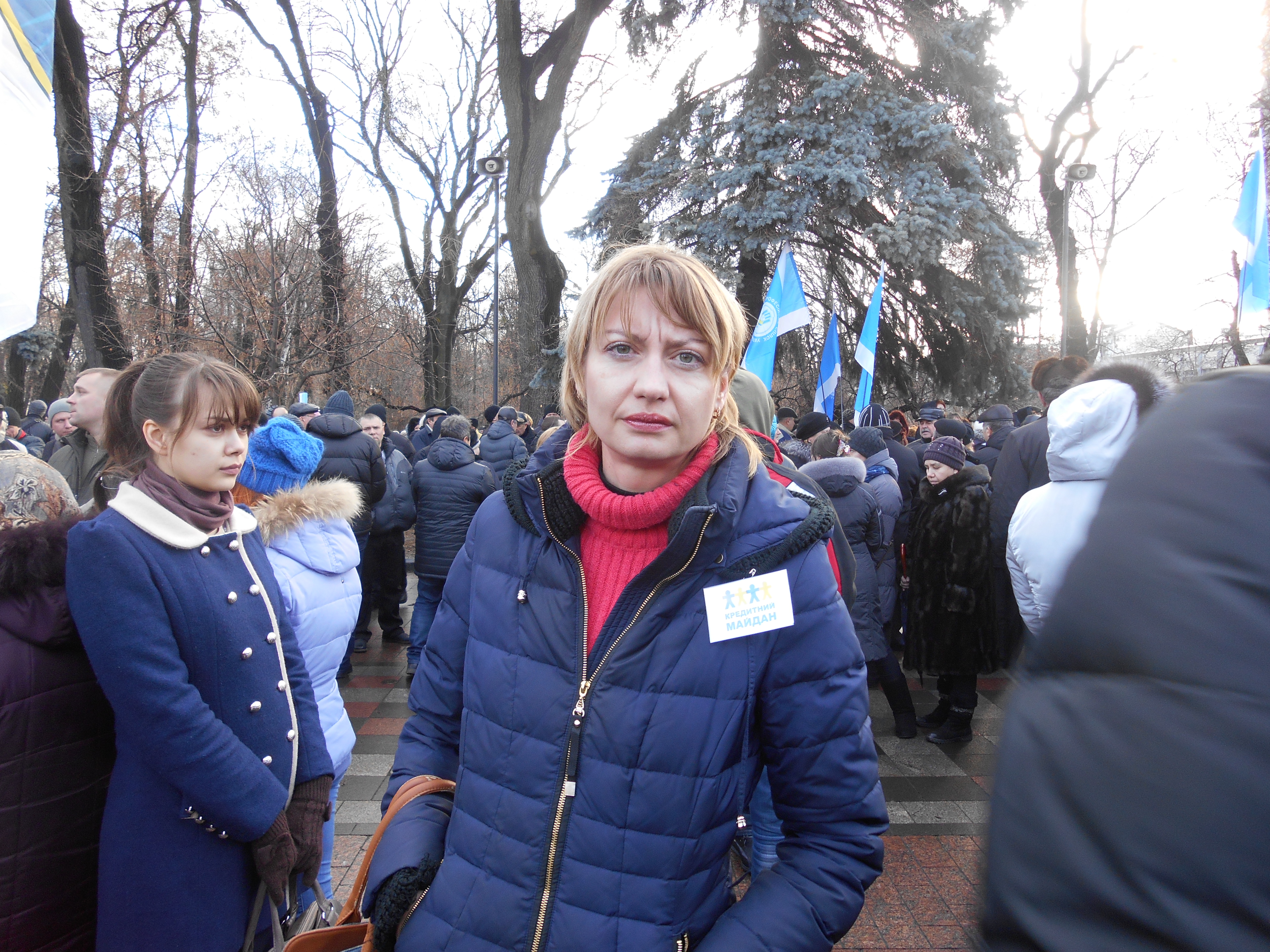 Приближаюсь к инициаторам финансового майдана. Это те ребята, которые недавно митинговали возле НБУ. Нахожу там женщину Елену из Днепропетровска.