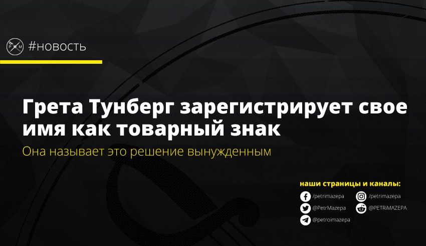 17-летняя активистка Грета Тунберг сообщила, что намерена зарегистрировать свое имя, а также название движений Fridays For Future и Skolstrejk för klimatet в качестве товарных знаков. По ее словам, такое решение было принято из-за того, что ее имя и название движений пытаются использовать в коммерческих целях без ее согласия и даже извещения.