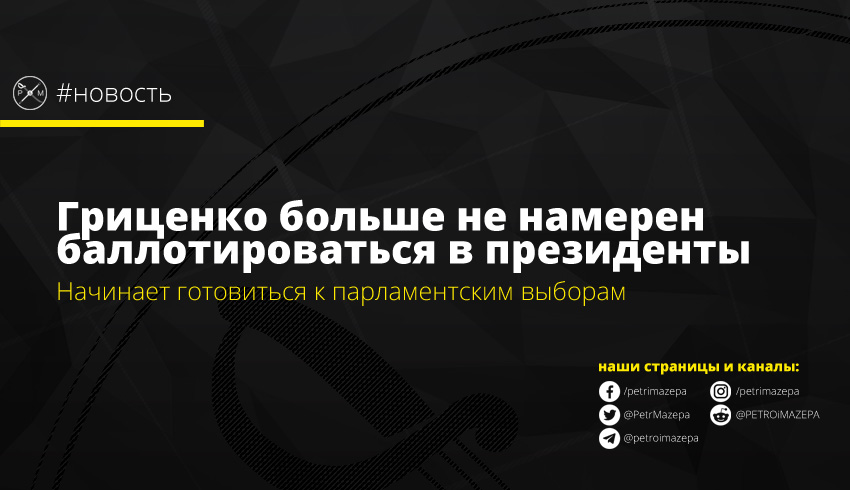 Во время интервью Гриценко рассказал, что баллотироваться на пост главы государства больше не станет. «Это точно», - цитирует слова Гриценко «Українська правда». Об этом он написал и на своей странице в Facebook. Но при этом политик отметил, что вместе со всей своей командой начинает подготовку к парламентским выборам.