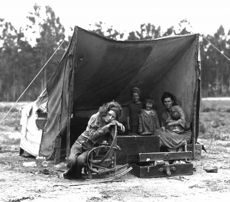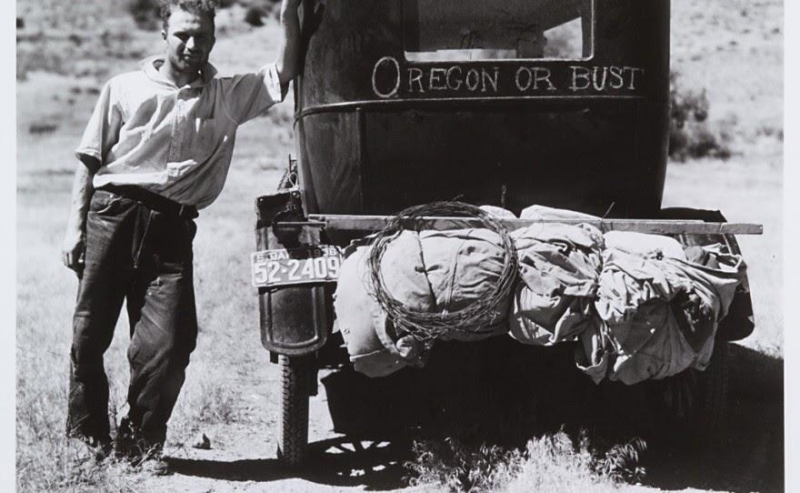 Одна из самых знаменитых фотографий той эпохи — поломанный драндулет и мать с ребенком в пыли у дороги. Фото постановочное, но семья настоящая. И оно хорошо передавало картину жизни той эпохи — мытарств «цыган урожая», следовавших за сезонными работами и «Оки», жителей Оклахомы и других штатов в эпицентре «чёрных вьюг», бегущих к морю от удушающих туч пыли.