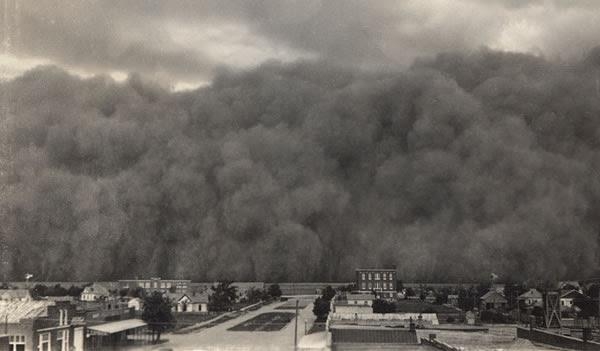 В 1932 году на Великих равнинах зафиксировали 14 пылевых бурь, через год их уже было 40. Это были не привычные нам ураганные порывы ветра и сломанные посевы. Нет. Это были чёрные удушливые вьюги, 5-7 тысяч тонн пыли за сутки. Невозможно было печь хлеб или готовить сыры — абразивные частички проникали сквозь окна, несмотря на замазку и пылевые экраны, хрустели на зубах, набивались в жернова мельниц, «убивали» закваску. Принять роды или провести операцию стало целой проблемой — попробуй санировать поле раны или вправить кость, когда в больнице в мутном свете лампы пляшет мёртвая взвесь и статическое электричество выводит из строя рентген. Лампочка на сотню ватт в комнате напоминала блеклый огонёк сигареты, и это не просто красивые слова для статьи, но дневники очевидцев.