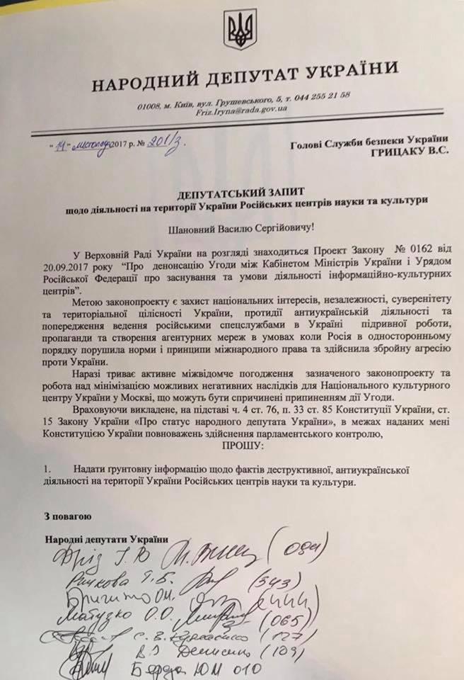 «Мы с коллегами обратились к председателю СБУ относительно предоставления фактов деструктивной антиукраинской деятельности Российских центров науки и культуры на территории Украины. Запрос будет оглашен в эту пятницу», - написала член комитета Верховной Рады по вопросам национальной безопасности и обороны Ирина Фриз в Facebook.