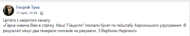 В то же время, еще 17 апреля подобную информацию разместил Георгий Тука. Тоже Херсонщина, какой-то штаб оккупантов и минус два генерала. Но уточнил, что били «Гиацинтами».