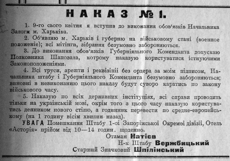 Оказавшись в Харькове, командующий Запорожской дивизией Александр Натиев немедленно взялся за переустройство жизни города: с одной стороны, были запрещены всякие большевистские штучки, типа обысков, арестов и реквизиций без ордера, но с другой — так и не разрешены митинги (военное положение всё же). А, и конечно, в городе вводилось европейское время и украинский язык в делопроизводстве. Кстати, этот приказ №1, напечатанный в харьковских газетах 9 апреля, не мог быть издан ни раньше, ни позже 8-го: пресса выходила на следующий день, эту задержку всегда нужно иметь в виду.