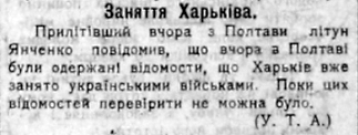 Вот киевская газета «Відродження» за 7 апреля сообщает, что днём ранее украинцы уже вошли в Харьков, да только знают об этом лишь в Полтаве. Обратите внимание, что журналисты не гонятся за жареными новостями, а честно признают, что информация не проверена.