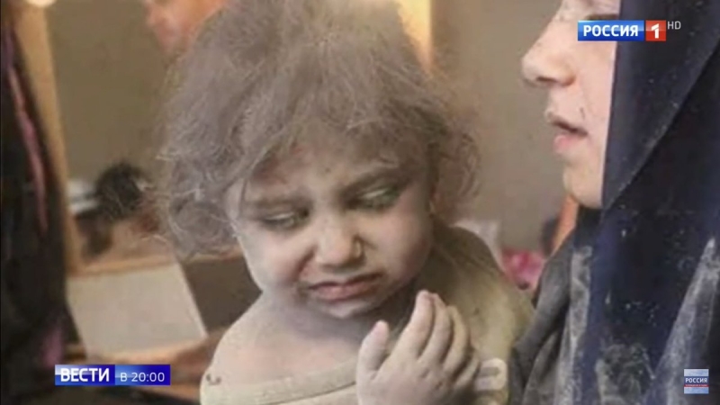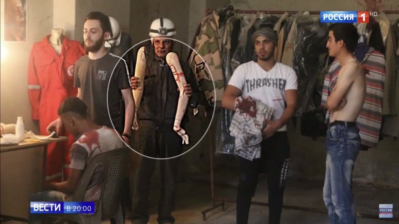 В репортаже показано несколько кадров, «поступивших в распоряжение» программы «Вести», которые якобы сняты на съёмочной площадке «Белых касок». Программа «Вести» подчеркнула якобы признаки участия «Белых касок» в фальсификации.