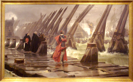 Ришелье на осаде Ла-Рошели. Картина Анри Мотте, 1881 год. Кардинал осматривает дамбу, которая должна помешать английскому морскому гуманитарному конвою попасть в порт города. На заднем плане, по всей видимости, происходит раздача муки и гречки