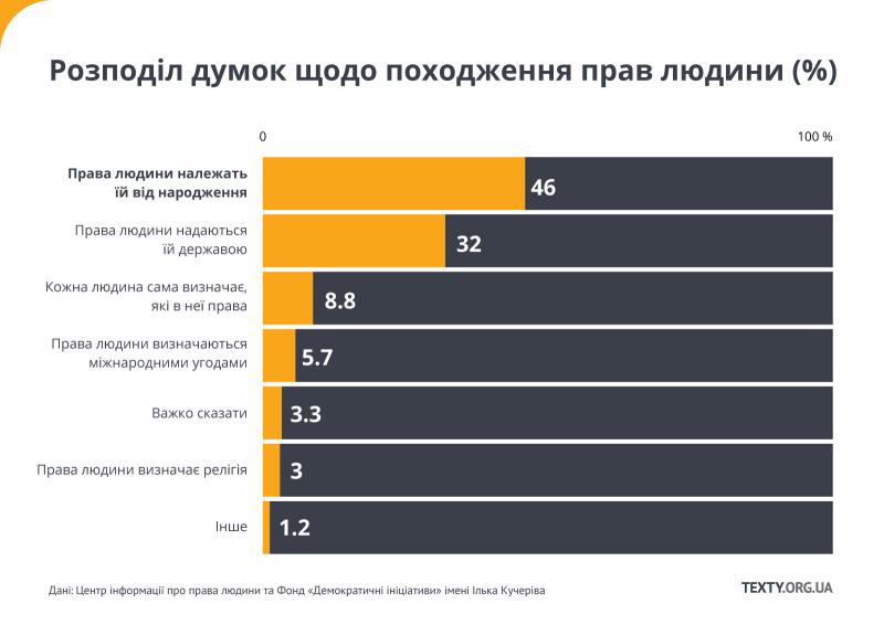 Тільки менше половини респондентів (46%) вважають, що права людині належать від народження. Ще 5% кажуть, що вони визначаються міжнародними угодами. Інша ж половина опитаних вважає джерелом прав державу, релігію, або переконані, що кожна людина сама визначає, які в неї права.