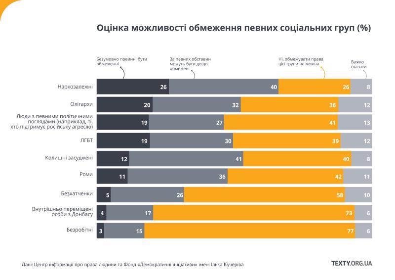 Принцип рівності не у пріоритеті в картині цінностей українців. Найбільше українці готові обмежувати права наркозалежних (26%), олігархів (20%), людей із непопулярними політичними поглядами (19%). Найменше — безробітних (3%).