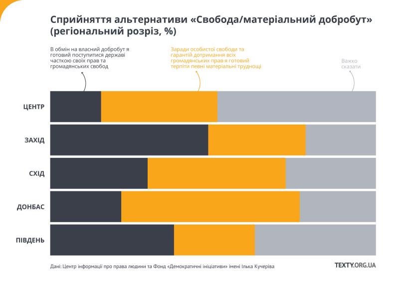Найбільше готове обміняти права та свободи населення Західного регіону (48,5%). Найменше — в Центральному (15,6%). Частіше за інших готові терпіти матеріальні труднощі заради збереження громадянських прав мешканці Донбасу (54,8%) та Східного регіону (42,4%).
