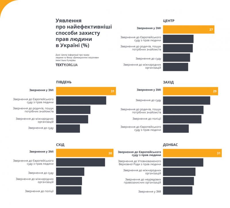 Вона наголошує, це видно й по багатьох інших питаннях. Якщо для Донбасу ефективними способами захисту прав людини є Європейський суд з прав людини, Омбудсман (уповноважений з прав людини — ред.), то на Заході та в Центрі люди йдуть до родичів та ЗМІ. (Про це читайте детальніше нижче у розділі «Як українці захищають свої права?»)