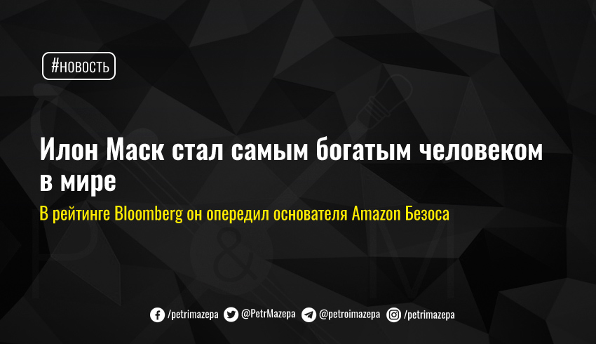 Основатель Tesla и SpaceX Илон Маск занял первую строчку в рейтинге миллиардеров Bloomberg, опередив Джефа Безоса и став самым богатым человеком планеты. Его состояние достигло 194,8 млрд долларов.