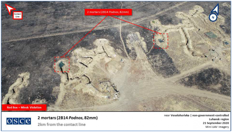 В то же время, в открытой части этого же отчета СММ ОБСЕ №228/2020 от 24 сентября 2020 года, есть информация про два 82-мм миномета. Но она немного искажена - указан другой населенный пункт - Надаровка, который находится на несколько километров дальше от линии столкновения.