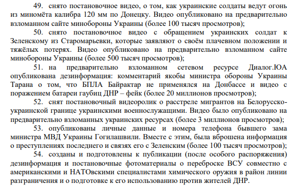 Полученный документ представляет собой отчет за 2021 год о мероприятиях по деструктивной информационной деятельности против Украины. По заверениям инсайдера, отчет указывает факты выполнения заданий в информационной сфере, поставленных «министерству» кураторами из российских спецслужб. В нем 54 пункта, особый интерес из которых вызывают 49-52 и 54. В 53-м боевики просто приписывают себе заслуги по созданию скандала с Гогилашвили.