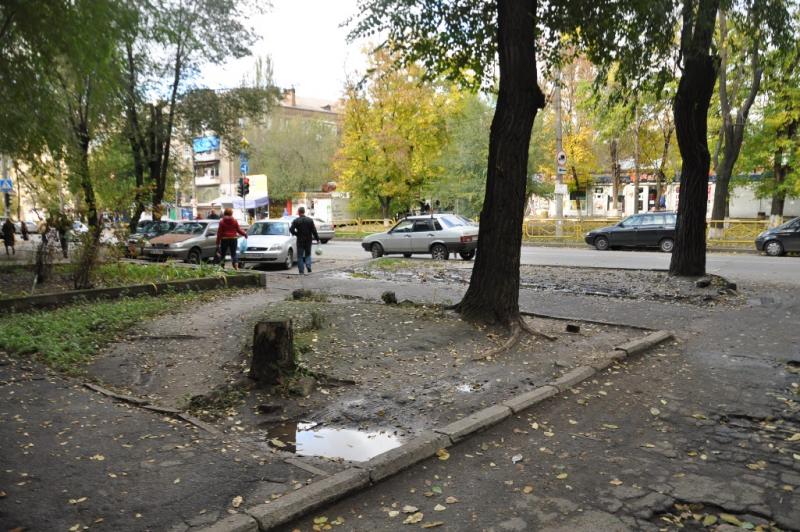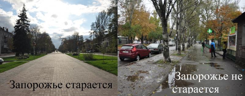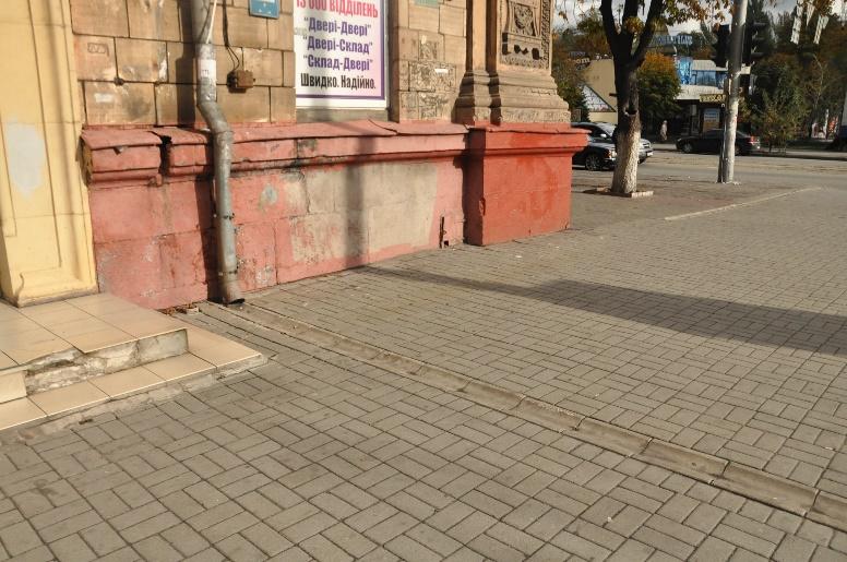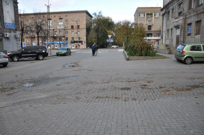 Обратите также внимание на качество запорожских тротуаров. В квартале от Соборного проспекта плитка на пешеходных зонах пропадает, превращаясь в дырявый асфальт.