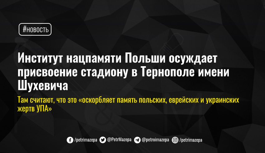 «Институт национальной памяти Польши протестует против названия стадиона в Тернополе в честь Романа Шучевича, который во время Второй мировой войны был офицером немецких полицейских батальонов, таких как "Нахтигаль ", а затем командиром УПА, ответственным за геноцид польского гражданского населения Волыни и Восточной Малопольши», - сообщили в пресс-центре Института национальной памяти Польши сообщил в Twitter.
