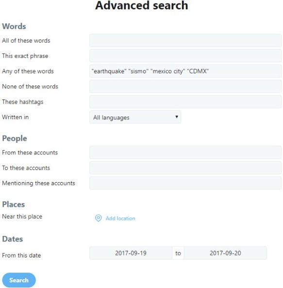 Ещё один полезный приём — использовать местный язык вместо английского. Если говорить о землетрясении в Мехико, то поиск принесёт больше результатов, если ввести «sismo» — испанское слово, означающее «землетрясение», или местное название Мехико — CDMX (сокращение от Ciudad de México). В противном случае среди результатов будут только посты от англоговорящих туристов и журналистов.