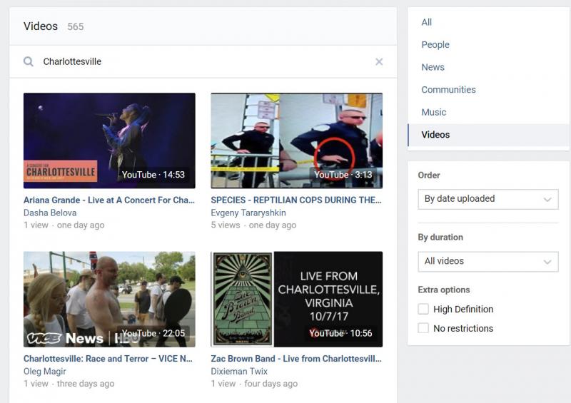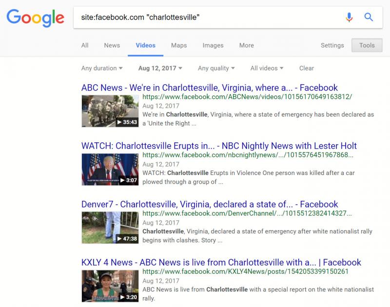 Из-за этого недостатка интерфейса поиск видео в Facebook, как и в YouTube, лучше проводить через Google. Если в video.google.com задать поиск видео с Facebook с ключевым словом «Charlottesville» от 12 августа 2017 года, можно получить полезные результаты (аналогично поиску видео с YouTube по дате).