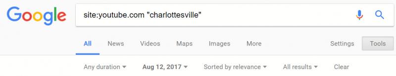 Однако если вас интересует более давнее событие, то удобнее будет задать поиск по видео с YouTube в Google, где параметров намного больше, нежели в интерфейсе YouTube. Ниже показано, как при помощи Google найти все видео с YouTube (site:youtube.com), опубликованные 12 августа 2017 года (чтобы ввести дату, используйте «Инструменты») и сопровождающиеся словом «Charlottesville» (в кавычках, чтобы получить только те результаты, в которых указано именно это слово).