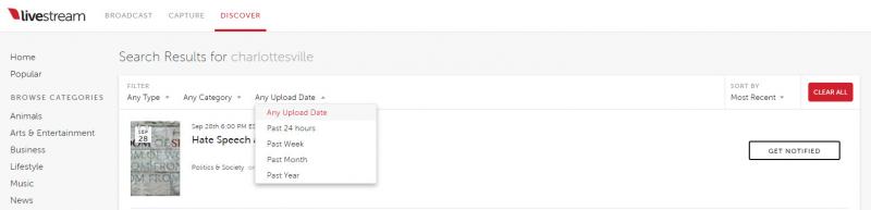 Livestream.com — один из самых старых сервисов в этом списке, утративший свою популярность после того, как функция прямой трансляции появилась в социальных сетях, тем не менее, есть те, кто всё ещё им пользуется. К счастью, поиск на Livestream.com имеет больше параметров, чем в Periscope и на других платформах, однако и здесь всё далеко не идеально. Так, поиск видео по дате не доступен — фильтры больше похожи на YouTube: выбрать определённый день нельзя, предлагаются только варианты «За сегодня» (Past 24 hours), «За эту неделю» (Past week) и т. п. Тем не менее, видео здесь публикуют меньше, чем в YouTube или Periscope, так что на то, чтобы отсеять из всего объёма нужные результаты, требуется не так много времени.