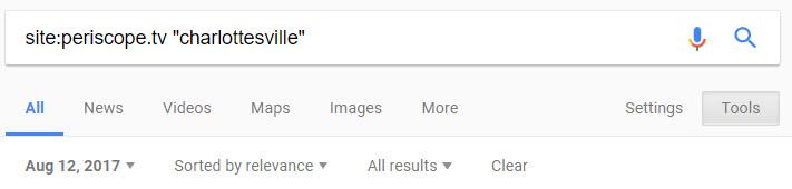 Секрет поиска прост — нужно знать подходящие ключевые слова и запастись достаточным терпением для того, чтобы просмотреть все результаты и отсеять нужные. При поиске видеозаписей определённых событий рекомендуется использовать не только распространённые хештеги и слова, по которым выпадет много результатов (например, #UnitetheRight и «Charlottesville» для протестов 12 августа). Подумайте о специфических словах, фразах и хештегах, которые написали бы местные жители, не рассчитывающие на то, чтобы вести массовую трансляцию. Представьте себя одним из них — как бы вы описали события, свидетелем которых стали? Может быть, упомянули бы название города или, скорее, так как аудитория у вас небольшая, выбрали бы какое-нибудь место, которое хорошо известно всем жителям. Так, когда человек из Шарлотсвилля публикует видео или фотографию, которые сделал рядом с домом, он навряд ли использует популярные хештеги или слово «Charlottesville», а скорее выберет более точечную локацию — например, название улицы или расположенный неподалёку объект (такой, как магазин или парк).
