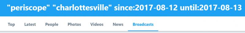 Такой поиск даст только ограниченный набор результатов. Почти все прямые трансляции с Periscope хотя бы раз упоминаются в Twitter — их публикуют либо те, кто снимал (аккаунты в Twitter часто связаны со стримами в Periscope), либо те, кто смотрел их в Periscope. Иногда полезнее оказывается задать аналогичный поиск в Google и Twitter, хотя в этом случае придётся просмотреть и отсеять большее количество результатов. Подходящие результаты могут попасться в разделах «Последнее» и «Видеозаписи» (пользователи часто упоминают определённые стримы), однако удобнее всего воспользоваться недавно добавленным разделом «Трансляции». В ответ на приведённый ниже запрос будут выведены все трансляции со словом «Charlottesville» в тексте самого твита и в Periscope (в том числе в URL-адресе) от 12 августа 2017 года (для того, чтобы в Twitter найти все записи, опубликованные в определённый день — в нашем случае 12 августа 2017 года, — необходимо ввести именно такие параметры since: («с:») и until: («по:»)).
