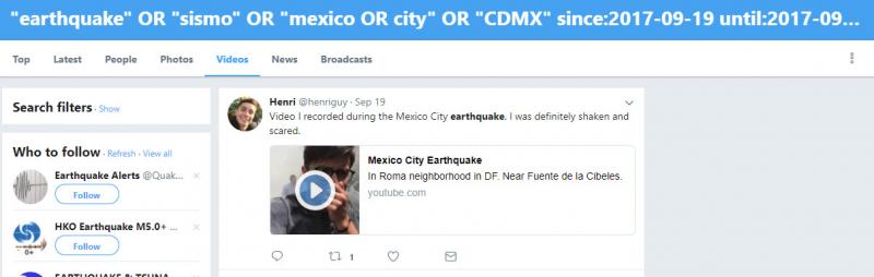 Недавно в Мехико случилось землетрясение. Чтобы посмотреть твиты обычных пользователей, запечатлевших это событие, можно отфильтровать записи по дате 19 сентября 2017 года (день, когда были зафиксированы подземные толчки). Для этого воспользуемся функцией расширенного поиска на twitter.com/search-advanced, применяя оператор «кавычки». Затем выбираем вкладку «Видеозаписи», чтобы просмотреть только видео.