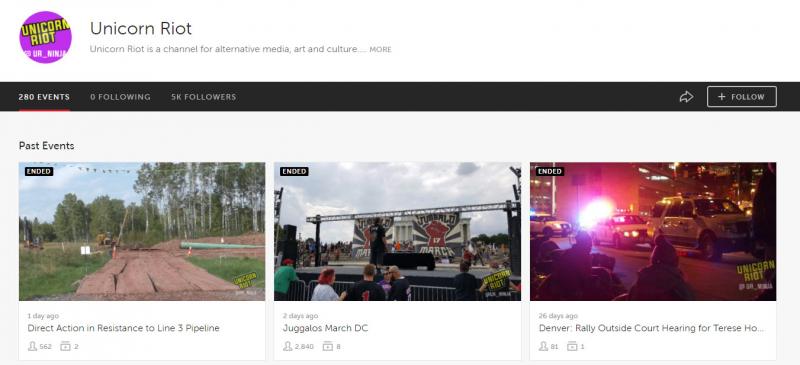 Как и на других сервисах, завершённые прямые трансляции хранятся в архивах. Как продемонстрировано ниже, на популярном канале Unicorn Riot, который часто ведёт репортажи с протестов, имеется около 300 заархивированных трансляций, доступных для просмотра.