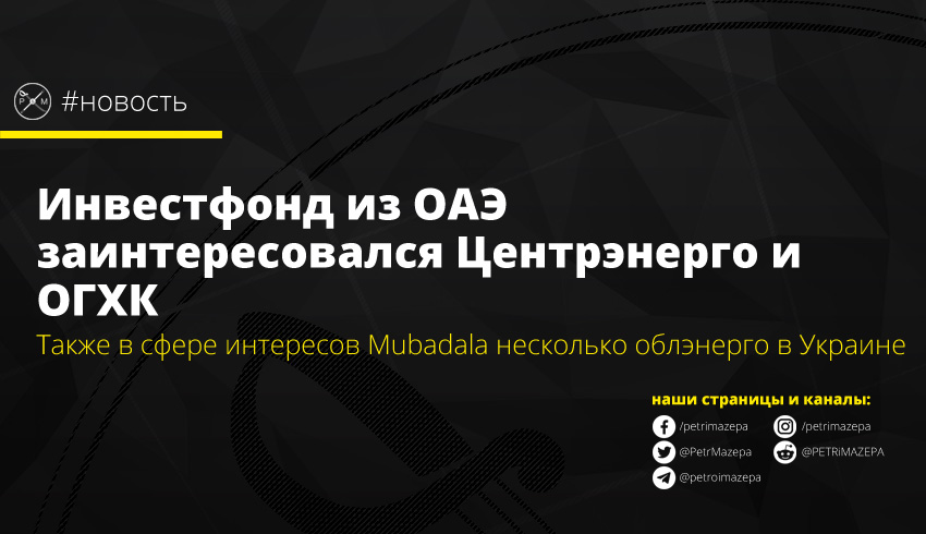 Инвестиционный фонд Mubadala (ОАЭ) заинтересован в семи украинских предприятиях, среди которых Объединенная горно-химическая компания (ОГХК), Центрэнерго и несколько облэнерго.