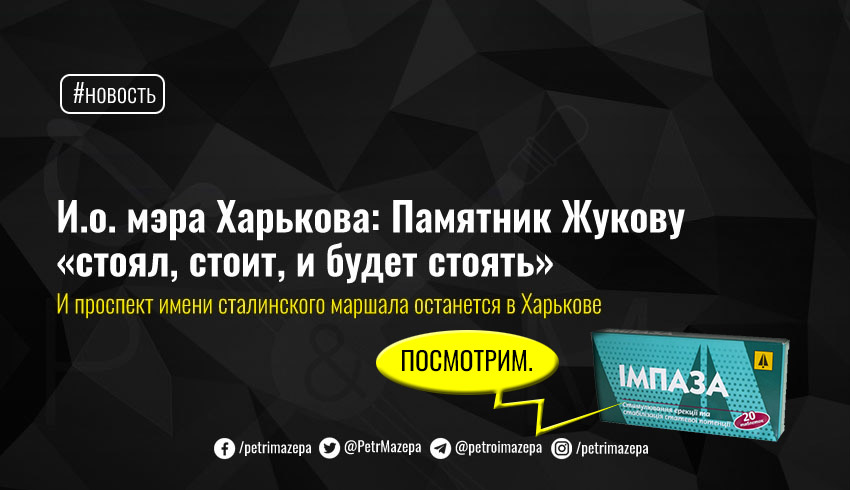 Исполняющий обязанности городского головы Харькова Игорь Терехов заявил, что памятник сталинскому маршалу Георгию Жукову в Харькове будет стоять, а проспект, который уже официально переименован в проспект Григоренко, продолжит носить имя Жукова.
