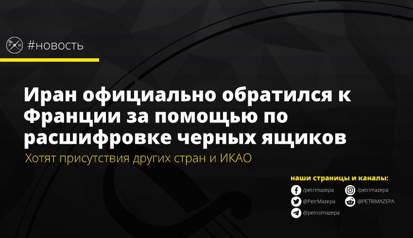 Об этом сообщает Reuters. «Организация гражданской авиации Ирана недавно обратилась с запросом в Бюро по расследованию авиакатастроф Франции о том, что бортовые самописцы должны быть направлены Ираном на территорию BEA во Франции, чтобы они были расшифрованы в присутствии представителей других причастных к вопросу стран и ИКАО, если Франция может обеспечить такую возможность», - цитирует издание представителя Ирана в ИКАО (международная организация гражданской авиации) Фархада Парвареша. При этом, французская сторона пока не получила официальный запрос и сейчас ведет переговоры с Ираном, Канадой и Украиной о предоставлении помощи.