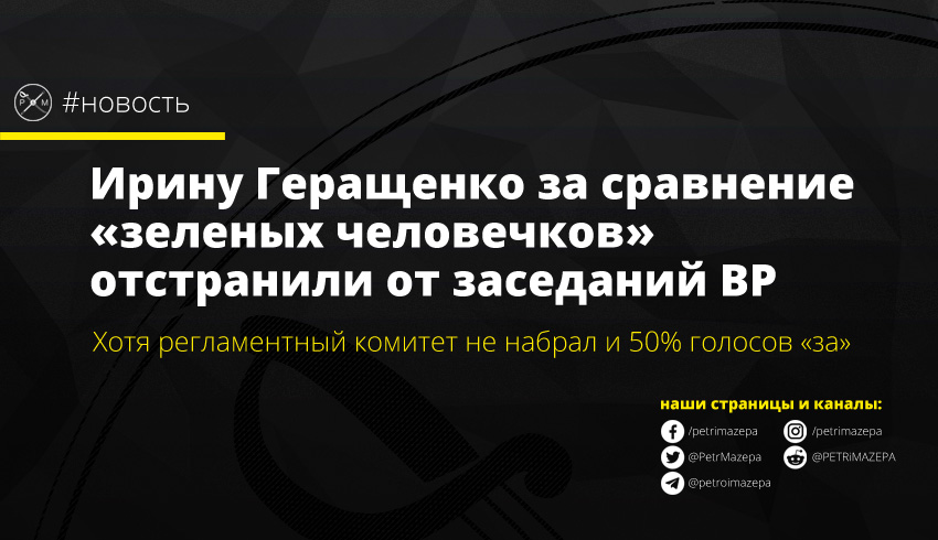 Во время своего выступления Геращенко сказала: «Знаете, пять лент назад "зеленые человечки" захватили Крым, сейчас "зеленые человечки" захватывают украинский парламент. И на самом деле – полностью его перечеркивают». Далее она хотела рассказать о правах и обязанностях народных депутатов, но спикер Дмитрий Разумков заявил о недопустимости подобных сравнений и отключил её микрофон. А теперь Регламентный комитет ВР 6 голосами за, 5 – против и 3 – воздержавшимися, проголосовал за решение об отстранении Геращенко от пяти следующих заседаний, пишет Еспресо.TV.