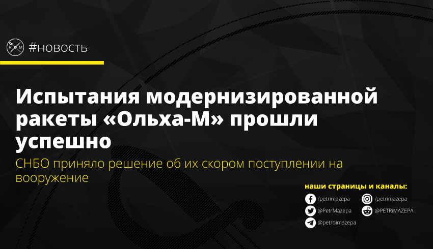 На юге Одесской области прошли успешные испытания модернизированных ракет реактивной системы залпового огня «Ольха-М» с увеличенной дальностью поражения. Производство ракет «Ольха-М» будет осуществляться в Украине по замкнутому циклу. Модернизированные ракеты в скором времени должны поступить на вооружение.