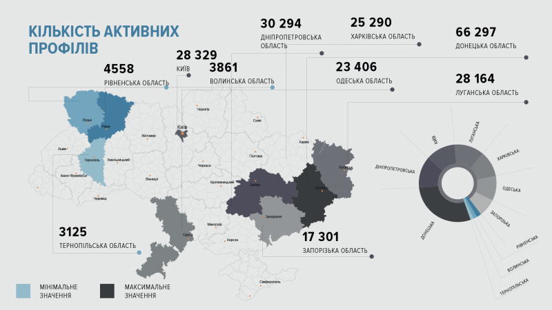 Аналитики исследовали 1 млн профилей украинского сегмента VK и почти 10 млн постов. Судя по результатам исследования первое место по количеству активных профилей «ВКонтакте» занимает Донецкая область, второе - Днепропетровская область, третье – Киев. На четвертом месте Луганская область, но от нее не слишком отстает Харьковская и Одесская.