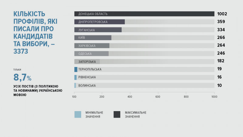 Большая часть активных профилей VK, которые писали на тему выборов - в Донецкой области (29,7%). За ней следует Днепропетровская область (10,7%), Луганская область (9,9%), а также Киев (7,9%). При этом лишь 8,7% от всех постов пользователей украинского сегмента «ВКонтакте» - это заметки с политикой и новостями на украинском языке.