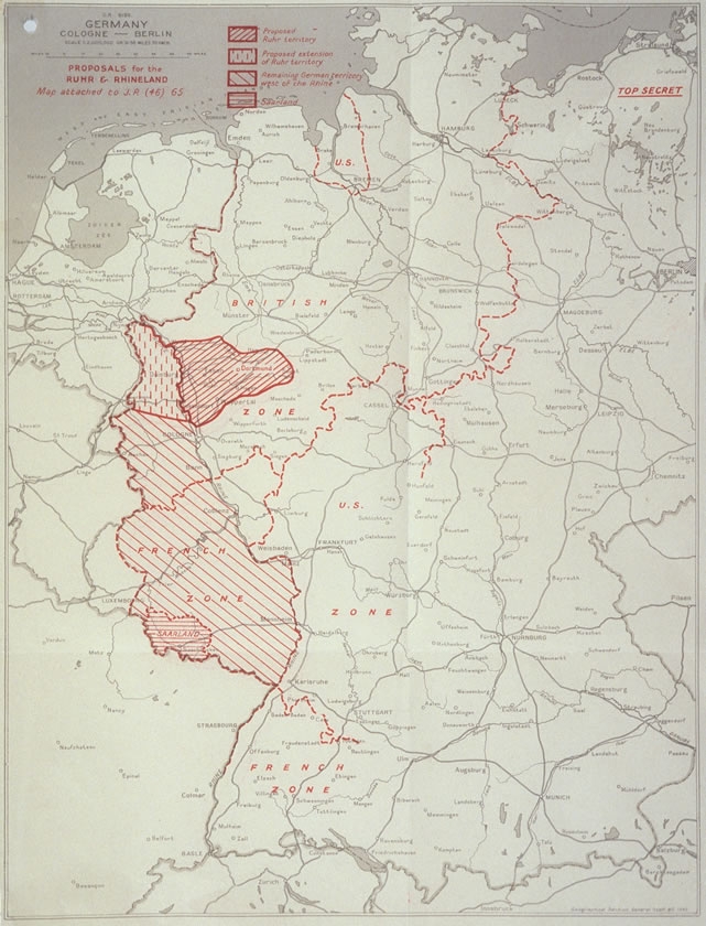 Получив собственную зону оккупации немецких земель, французы создали свой протекторат в Сааре и хотели установить особый статус для Рурской области. Эти два региона были богаты углём и являлись ключевыми центрами немецкой тяжелой промышленности и металлургии, потеря которых была бы очень болезненной для германской экономики. Но тут вмешались США и Великобритания. Они опасались, что политика Франции слишком ослабит Германию, и та окажется лёгкой добычей для коммунистов.