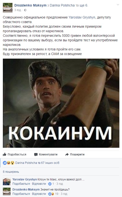 И предложил я ему пройти тест на их употребление, публично, в фейсбук