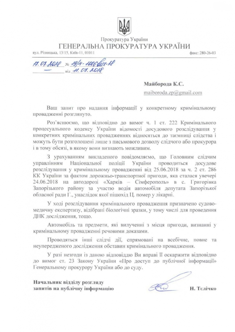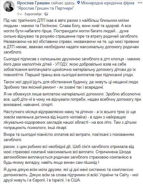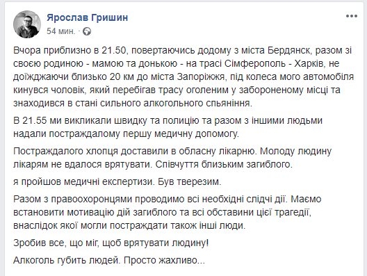 Итак, депутат Запорожского областного совета Ярослав Гришин сбивает человека. Насмерть. Выкладывает об этом пост в фб: