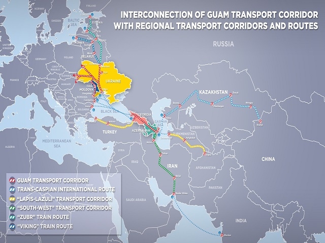 Баку — важный хаб Срединного коридора, альтернативного маршрута между Европой и Китаем. Запуск 3 года назад железной дороги Баку-Тбилиси-Карс открыл возможность простого транзита из Азербайджана через Грузию в Турцию. «Я верю, что, когда Транспортный коридор ГУАМ полностью заработает, он сможет считаться частью Срединного коридора и сможет открыть доступ к возможностям других интересных географических мест и установить связи с другими коридорами и маршрутами».
