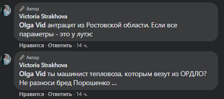 В комментариях к своему свежему посту Страхова сообщила, что поставляемый уголь – «антрацит из Ростовской области». Хотя в той же ветке было про «бред Порошенко» и «я анонимным аккаунтам порохоботского содержания обычно не отвечаю». Так что, если захотите срачей – вам сюда.