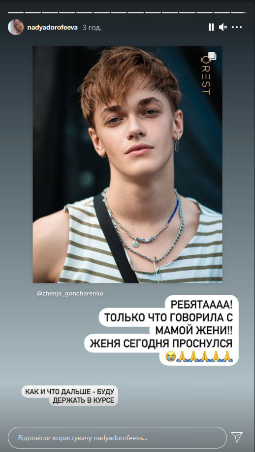 Танцор шоу-балета Надежды Дорофеевой Евгений спустя 15 дней после избиения вышел из комы. Об этом сообщила сама певица в Instagram.