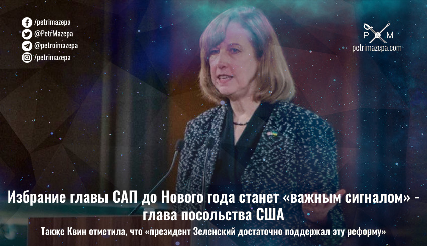 «Антикоррупционная реформа является еще одним очень важным вопросом, над которым мы очень тесно сотрудничаем. И США, и G7 работали с Украиной, сейчас идет процесс выбора нового руководителя САП. Это почти завершено, и мы очень надеемся, что все же будет завершено к Новому году. И это было бы очень важным сигналом для внешнего мира и для украинцев, что Украина движется вперед, серьезно относится к антикоррупционной работе», - сообщила Квин «Суспільному».