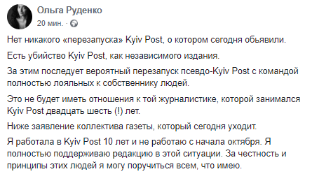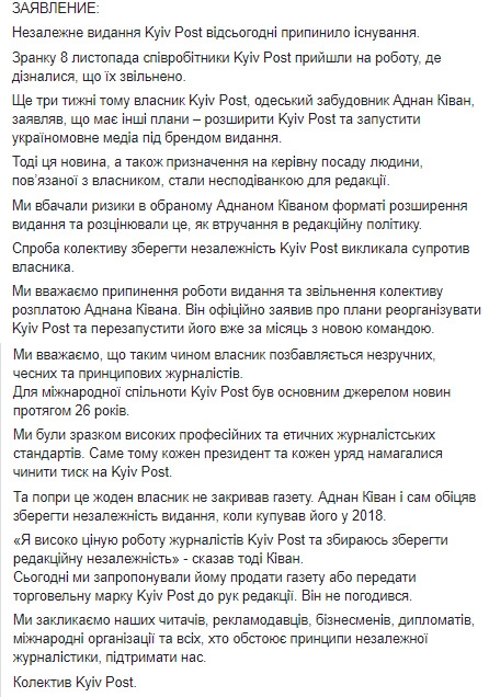 Позднее появилось и более полное заявление от коллектива закрытого издания. Краткая суть которого сводится к тому, что «нет никакого "перезапуска" Kyiv Post, о котором сегодня объявили. Есть убийство Kyiv Post, как независимого издания».