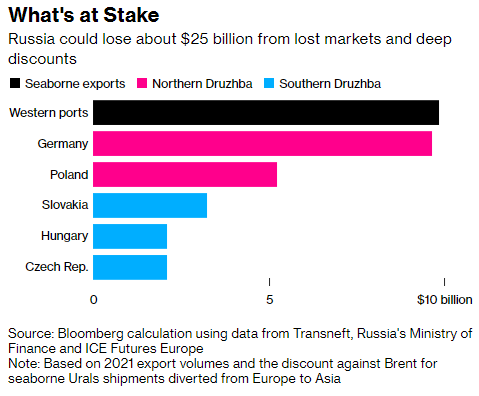 Планируется, что нефтяное эмбарго затронет поставки по морю, а также поставки по нефтепроводу «Дружба» для Германии и Польши. По их подсчетам, морские поставки в Евросоюз приносили россии 9,87 млрд долларов, поставки в Германию 9,66 млрд долларов, и в Польшу 5,23 млрд долларов. Причина таких финансовых потерь в том, что россии придется продавать нефть в Азии намного дешевле, чем ее покупала Европа.
