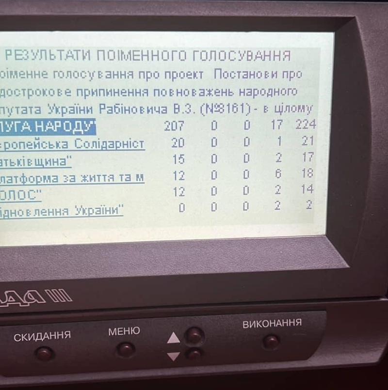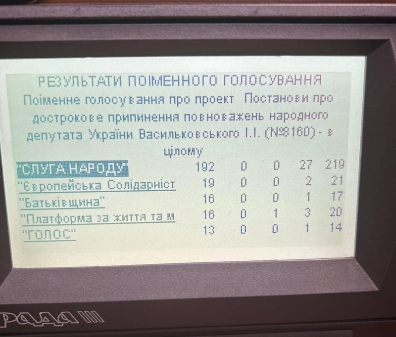 Также фото с результатами голосования делится «Главком». Издание подчеркивает, что голосов против лишения мандата Васильковского не было, а против лишения мандата Рабиновича проголосовал 1 депутат из «За майбутнє».